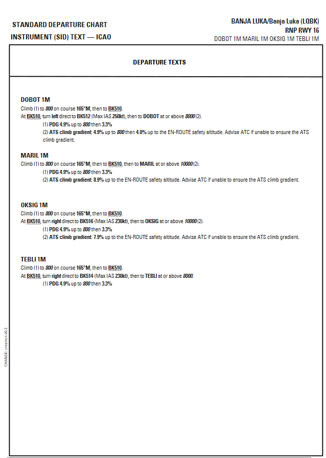 With this AIP SUP a trial PBN satellite based procedures RNP 1 SID RWY 16 are available for testing purposes at Banja Luka Airport. The satellite instrument flight procedures are GNSS based and contain SID flight procedures for RWY 16.