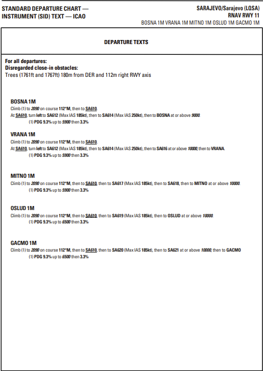 With this AIRAC AIP SUP a trial PBN satellite based RNAV SIDs RWY 11 are available for testing purpose only at Sarajevo Airport. The satellite instrument flight procedure is GNSS based and contain SID flight procedures for RWY 11.