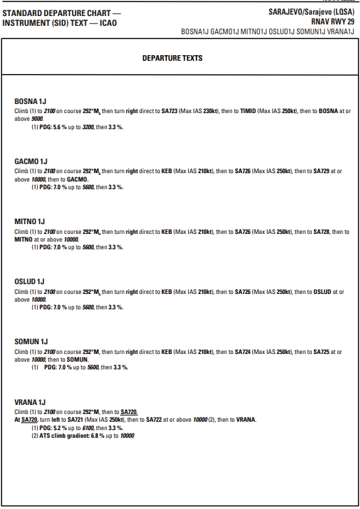 With this AIRAC AIP SUP a trial PBN satellite based RNAV SIDs RWY 29 are available for testing purpose only at Sarajevo Airport. The satellite instrument flight procedure is GNSS based and contain SID flight procedures for RWY 29.